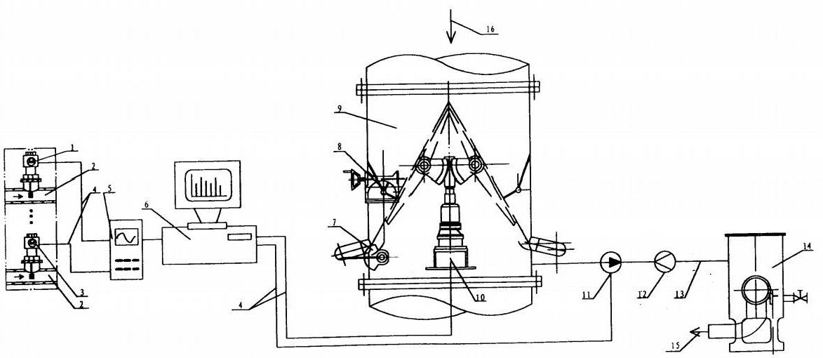 圖中:1、壓力壓差變送器2、凝汽器冷凝水分管道3、溫度測(cè)量變送器4、信號(hào)電纜5、污垢熱阻監(jiān)測(cè)儀6、多媒體計(jì)算機(jī)7、出球水量調(diào)節(jié)器8、阻渦流調(diào)節(jié)器9、收球網(wǎng)10、電動(dòng)執(zhí)行機(jī)構(gòu)11、膠球泵12、防止膠球倒流止回裝置13、管道14、裝球室15、箭頭16、箭頭