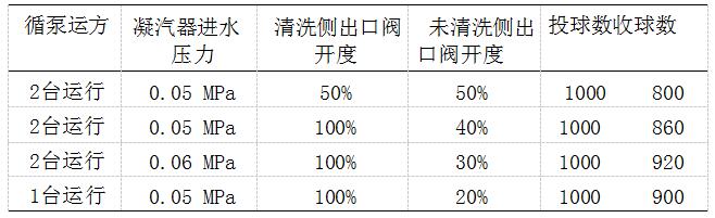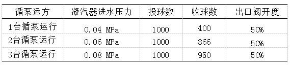 通過表2可看出,隨著循泵運行臺數增加,凝汽器的進口壓力升高,進、出口差壓增大,收球率大大提高。