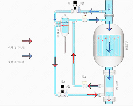 整個循環編程五分鐘,每小時清洗兩次。也可以根據具體情況進行改變清洗次數。通過冷卻水自身流量,小球發到冷凝管進行清洗,通過壓差球回到發射器。當球回到發射器時,累積在球上的污垢將會在發射器中進行反沖洗,發射器上端需要有透明視窗可以觀看到發球和收球狀態,保持每天至少40次循環。從而保證每臺冷凝管在200小時內都能被清洗到。