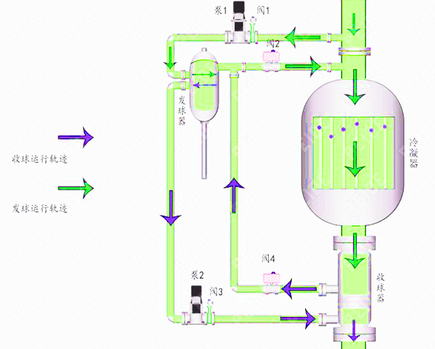 冷凝器膠球在線清洗裝置系統(tǒng)由二次濾網(wǎng)、收球網(wǎng)、裝球室、膠球泵、分匯器、閥門管路和電器控制裝置構(gòu)成。選用合適的海綿膠球,球的濕態(tài)直徑比冷卻管內(nèi)徑略大一點(diǎn)(約1~2mm),且濕態(tài)比重和水相近,將膠球投入裝球室內(nèi),數(shù)量為凝汽器進(jìn)水室銅管數(shù)的15%左右,將裝球室封嚴(yán),然后啟動(dòng)膠球泵,打開系統(tǒng)兩端碟閥,膠球就在循環(huán)水進(jìn)出口壓力差的作用下,被擠壓通過冷卻管,對(duì)冷卻管內(nèi)徑進(jìn)行一次抹擦,使管內(nèi)壁污垢隨水流帶出,膠球隨循環(huán)水經(jīng)出水管進(jìn)入收球網(wǎng),在收球網(wǎng)板的阻攔下,把膠球分離出來,由膠球泵抽出重新回到裝球室,如此循環(huán)返復(fù)對(duì)凝汽器冷卻管實(shí)現(xiàn)連續(xù)自動(dòng)清洗。當(dāng)清洗3個(gè)小時(shí)左右后,操作裝球室內(nèi)的漏斗回位,運(yùn)行3~5分鐘后即可收球。