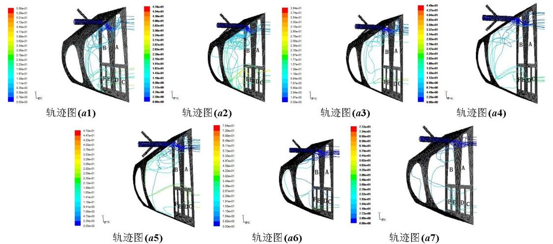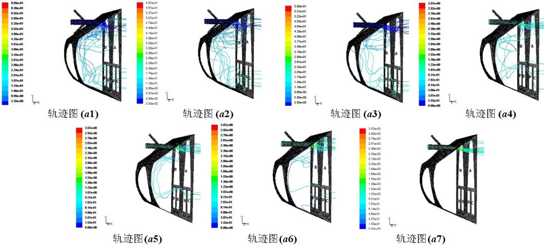1m/s,a1表示射流速度U=1.3m/s、膠球速度V=1m/s。射流速度為1.3m/s時結果分析圖6表示對A區域上部分冷卻管束進行清洗,射流速度為1.3m/s時,送球速度分別為1.0m/s、1.2m/s、1.4m/s、1.6m/s、1.8m/s、2.0m/s、2.2m/s,進口水室內的流線圖和膠球軌跡圖。對膠球通過A、B、C、D、E、F6個區域的情況進行統計,結果見表1。