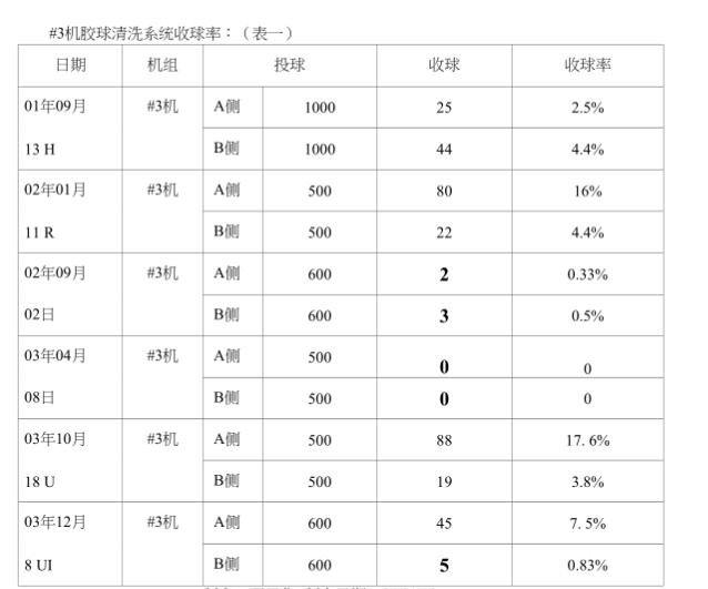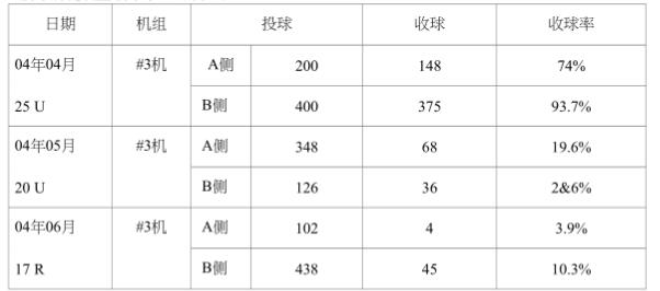 1#3機膠球清洗裝置系統(tǒng)收球率情況調(diào)查:我們小組把我廠2001一2003年度#3機膠球清洗裝置系統(tǒng)投、收球情況全部進(jìn)行了核查,發(fā)現(xiàn)收球率實在太低,有時加人幾百個球其至連-個球都收不到,現(xiàn)摘錄其中兒次投、收球數(shù)據(jù),以供大家了解我廠“收球率。