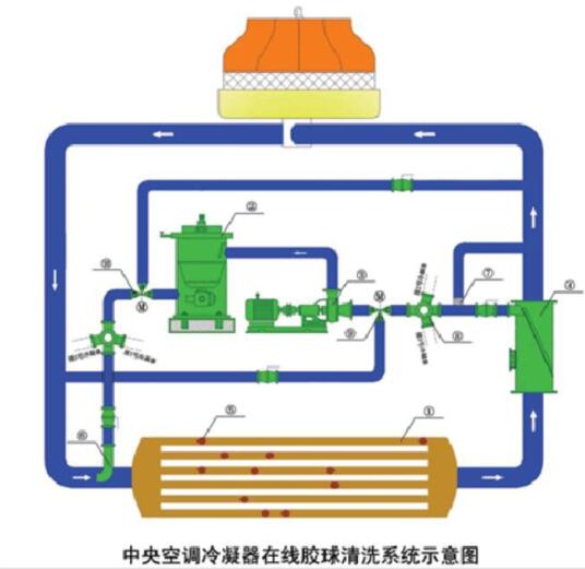 膠球清洗裝置{中央空調冷凝器自動在線膠球清洗裝置}系統原理:其基本原理就是借助水流的作用,將濕態直徑稍大于冷凝管內徑的膠球