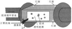 自動監測系統示意圖如圖1所示。該系統可以自動地監測回收膠球的數量及其半徑,這樣運行人員就可以根據檢測結果適時地添加或更換膠球,保證膠球的數量以及質量,以期達到佳的清洗效果。通過多次試驗,攝像機的佳有效位置及其范圍得以確定,并根據強度承受力和光照特點選擇了合適的材料。本系統硬件配置如圖2所示,其中透明管道材料為鑄造鋼、光學玻璃,管道內側不同角度裝有頻閃燈,攝像機拍攝角度垂直于密封玻璃面,拍攝焦距可調。